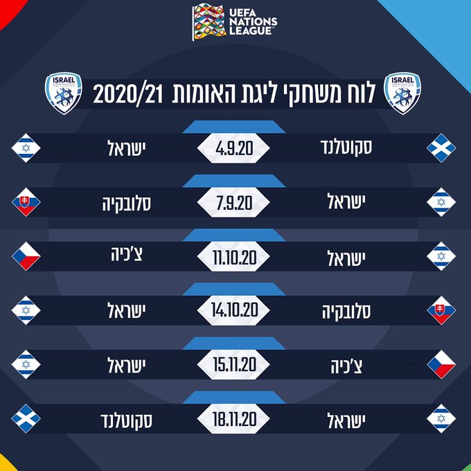 חודש לאחר מכן באוקטובר ב-910 ישראל שוב תשחק בסקוטלנד וב-1210 תגיע לישראל נבחרת מולדובה החלשה. לוח המשחקים המלא של נבחרת ישראל מחזור 1 סקוטלנד ישראל 492020 מחזור 2 ישראל סלובקיה 792020. צוות מקצועי - נבחרות צעירות.